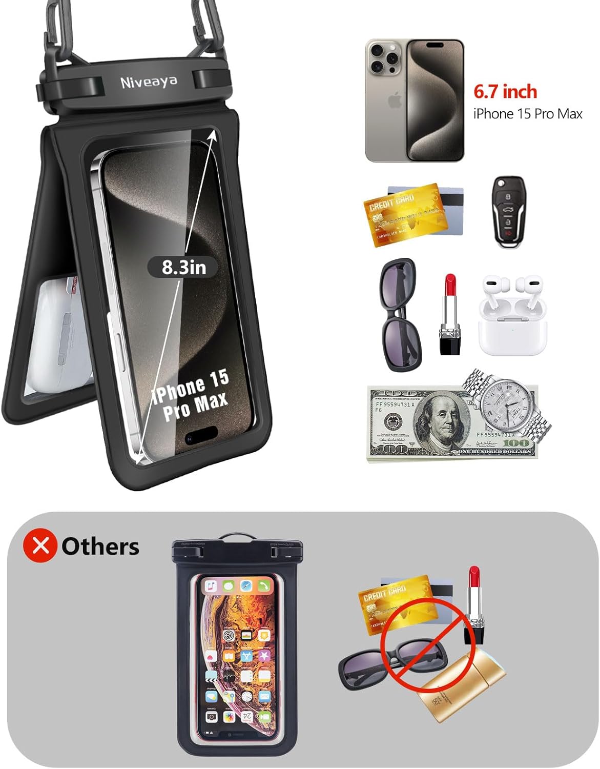 Niveaya Double Space Waterproof Phone Pouch – 2 Pack, Waterproof Phone Lanyard Case with iPhone 16/15/14/13/12 Pro Max up to 8.3″, Phone Dry Bags for Vacation Beach Pool Kayak Cruise Travel Essentials